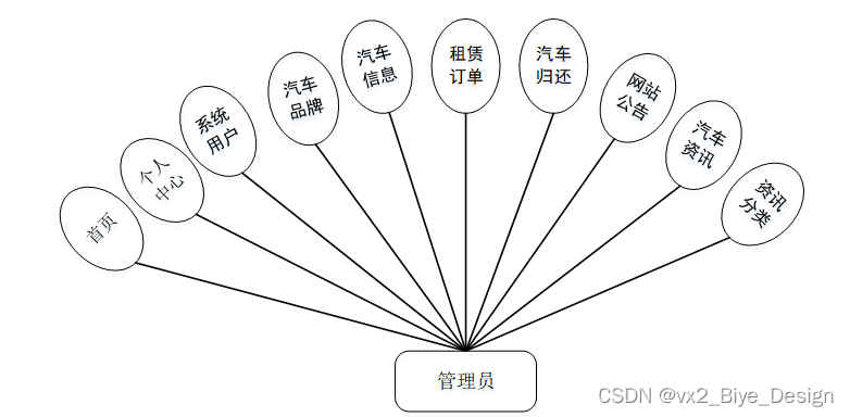 基于汽车租赁系统的设计基于现有的手机,可以实现管理员:用户管理、汽车分类、汽车品牌、汽车信息、汽车租赁、汽车归还等详细的了解及统计分析。根据系统功能需求建立的模块关系图如下图: