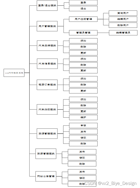 这些功能可以充分满足汽车租赁系统的需求。此系统功能较为全面如下图系统功能结构如图4-5所示。