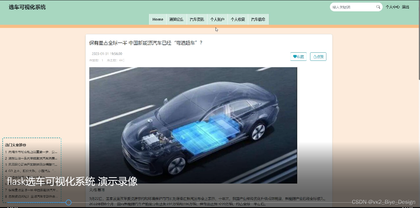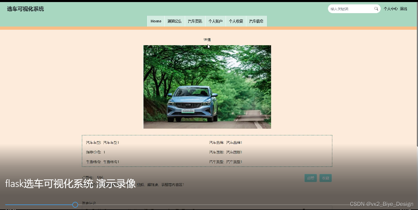 注册用户登录系统后,在此页面可以查看推荐的汽车资讯信息,并通过筛选,排序等操作进行汽车资讯信息查询,进入资讯详情界面后可以进行收藏,点赞,评论等操作,过程如下图所示。