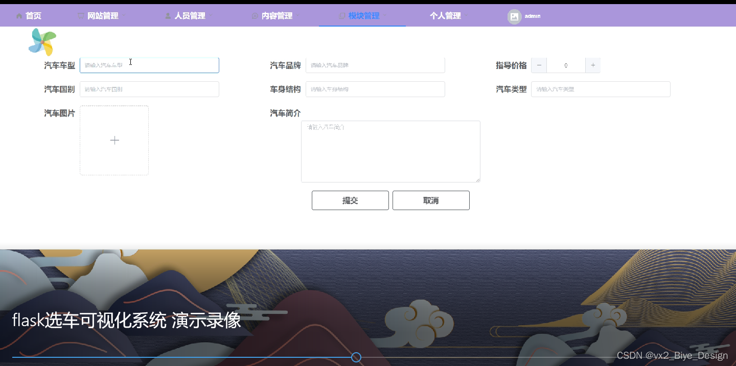 后台首页,网站管理(轮播图,通知公告),人员管理(普通用户、管理员),内容管理(汽车资讯、资讯分类),模块管理(销量数据、汽车信息、品牌销量、车型销量、价格走势、价位销量),个人管理等功能模块。