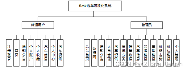 选车可视化系统的功能主要分为用户和管理员,实现首页,网站管理(轮播图,通知公告),人员管理(普通用户、管理员),内容管理(汽车资讯、资讯分类),模块管理(销量数据、汽车信息、品牌销量、车型销量、价格走势、价位销量),个人管理等功能模块。