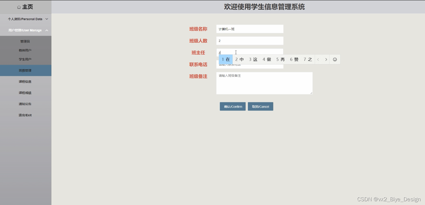 管理员进入到班级管理界面,通过界面的任务大厅,登录成功后进入到系统通过填写班级名称、班级人数、班主任、联系电话等信息并提交,如图5-9所示。