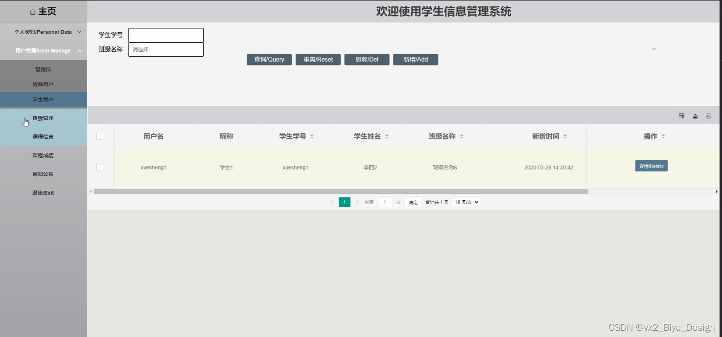 This design mainly implements a student information management system that integrates the advantages of humanization, efficiency, and convenience. It completes various functional systems such as home page, personal information, user management (administrator, teacher user, student user), class management, course information, course scores, and notification announcements. The system communicates with the server through a browser to achieve data interaction and change. You can operate the system by moving your fingers through a computer to achieve data communication management. The entire system design process fully considers the issues of data security, stability, and reliability, and the operation process is simple. This system improves work efficiency and reduces errors and omissions in data storage through scientific management methods and convenient services.