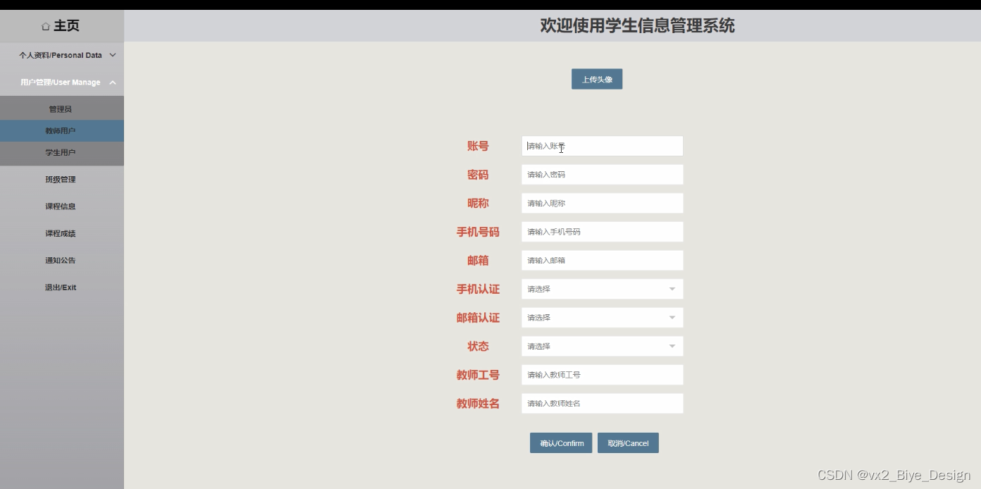 用户首页页面可以查看学生管理、课程信息、课程成绩、通知公告等信息,进行提交操作,如图5-2所示。