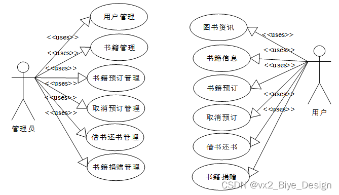 管理员模块:系统用户管理、书籍信息管理、书籍类型管理、借书还书管理、预订记录管理、取消预订管理、书籍捐赠管理。