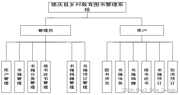 根据用户对系统的需求,要求系统简单操作,能够准确,完整的对信息进行管理。德庆县乡村教育图书管理系统在对需求做解析后,整个系统主要分为两个部分:管理员和普通用户,每个模块下的分支功能不一样。对功能做出如下说明: