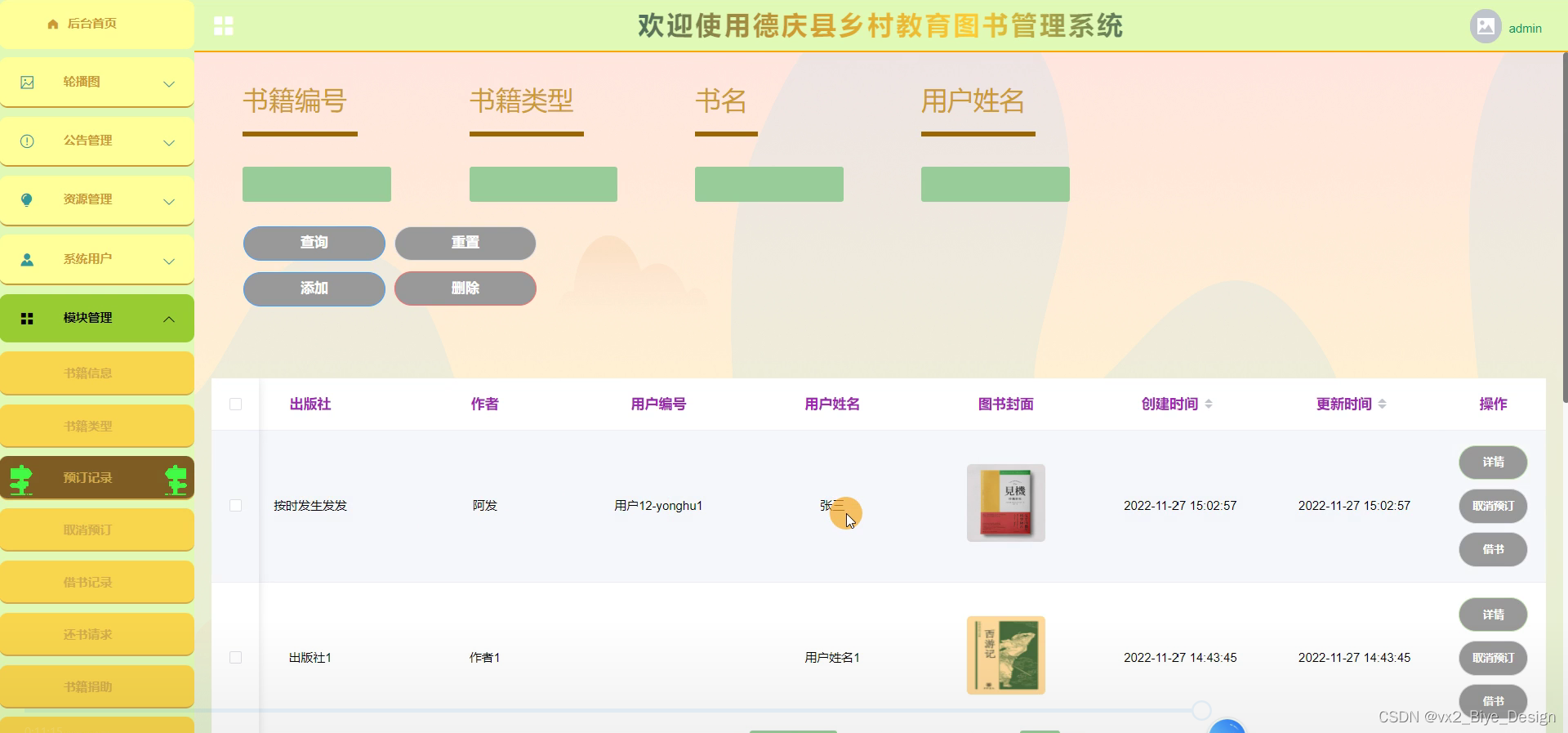 系统开发是采用java语言,基于MVVM模式进行开发,采取MySQL作为后台数据的主要存储单元,采用SSM框架实现了本系统的全部功能。德庆县乡村教育图书管理系统解决了传统管理方式所带来的人力、物力和时间上的虚耗和交流深度的限定,这让交流的过程更快捷、准确、便利,同时完成德庆县乡村教育图书管理系统的基本功能:书籍管理、用户注册管理、预订记录管理、借书还书管理、书籍捐赠管理。