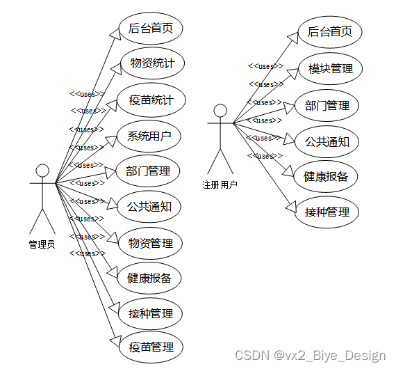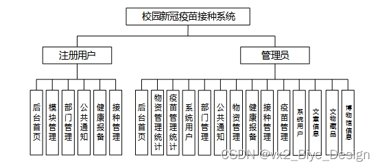 (1)功能要求:后台首页,物资管理统计,疫苗管理统计,系统用户(管理员,注册用户),模块管理(部门管理,公共通知,物资管理,健康报备,接种管理,疫苗管理)等功能模块。