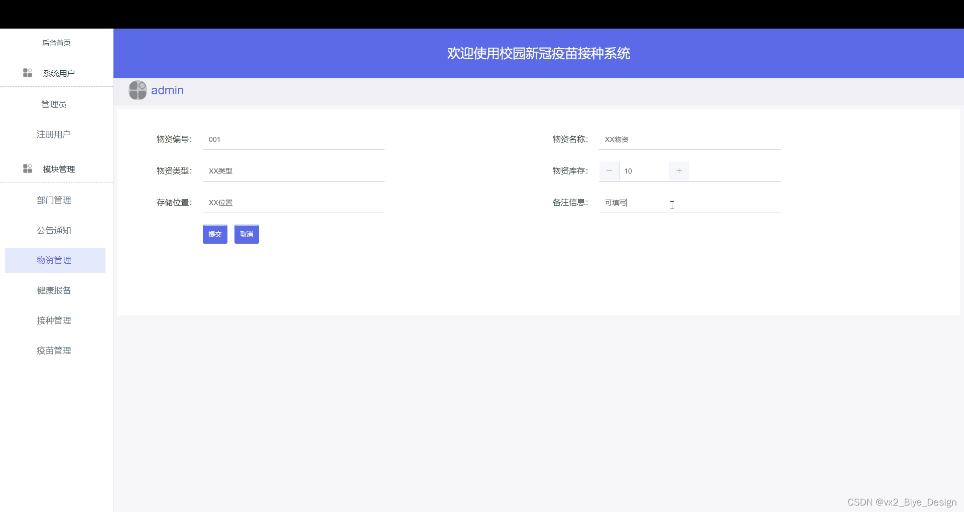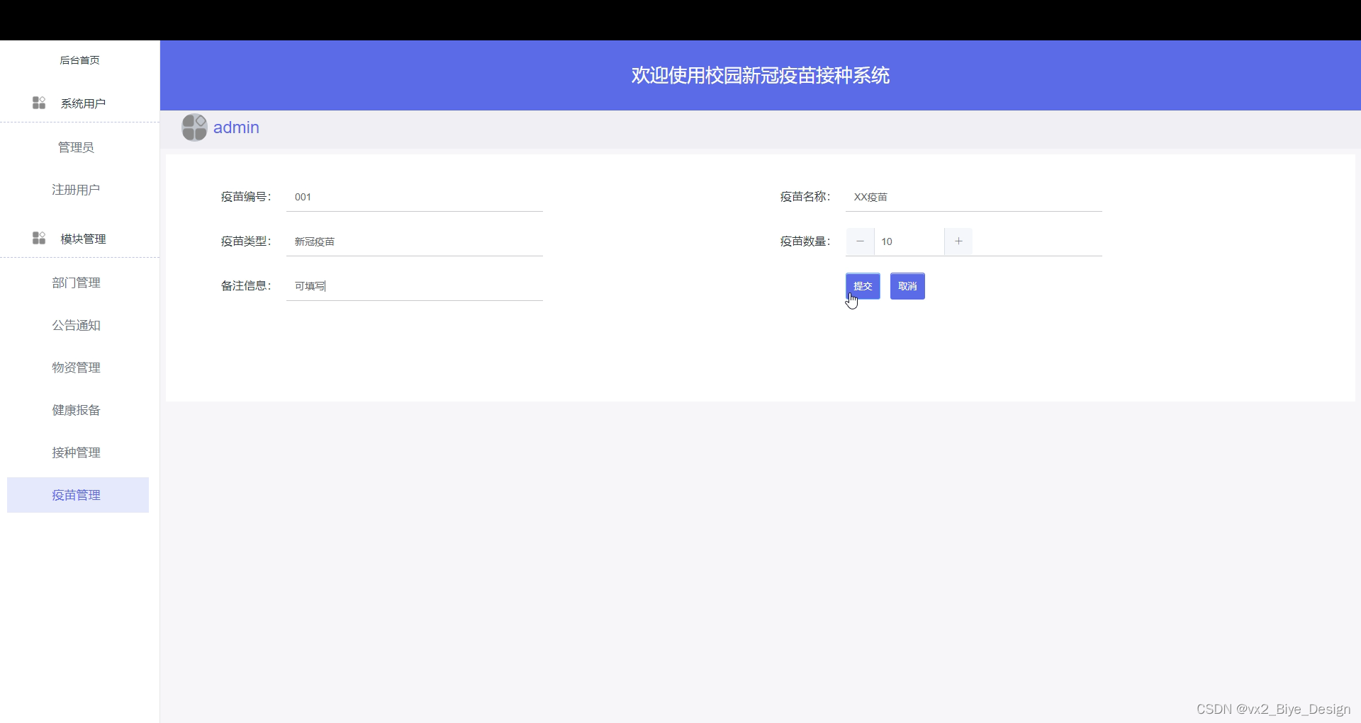 3、功能的完善性:后台首页,物资管理统计,疫苗管理统计,系统用户(管理员,注册用户),模块管理(部门管理,公共通知,物资管理,健康报备,接种管理,疫苗管理)等模块的修改维护操作。