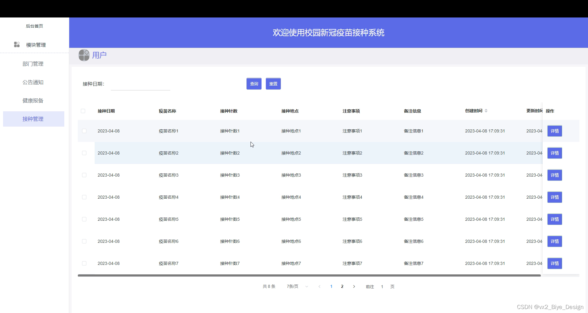 2、即时可见:对校园新冠疫苗接种系统信息的处理将可以实时查询到,从而实现“即时发布、即时见效”的系统功能。