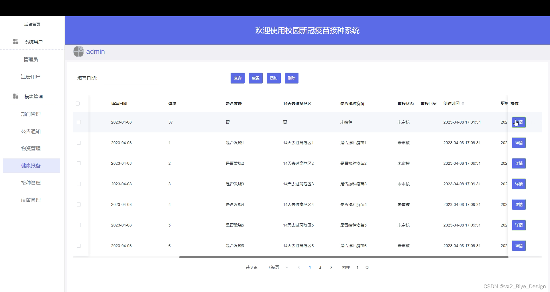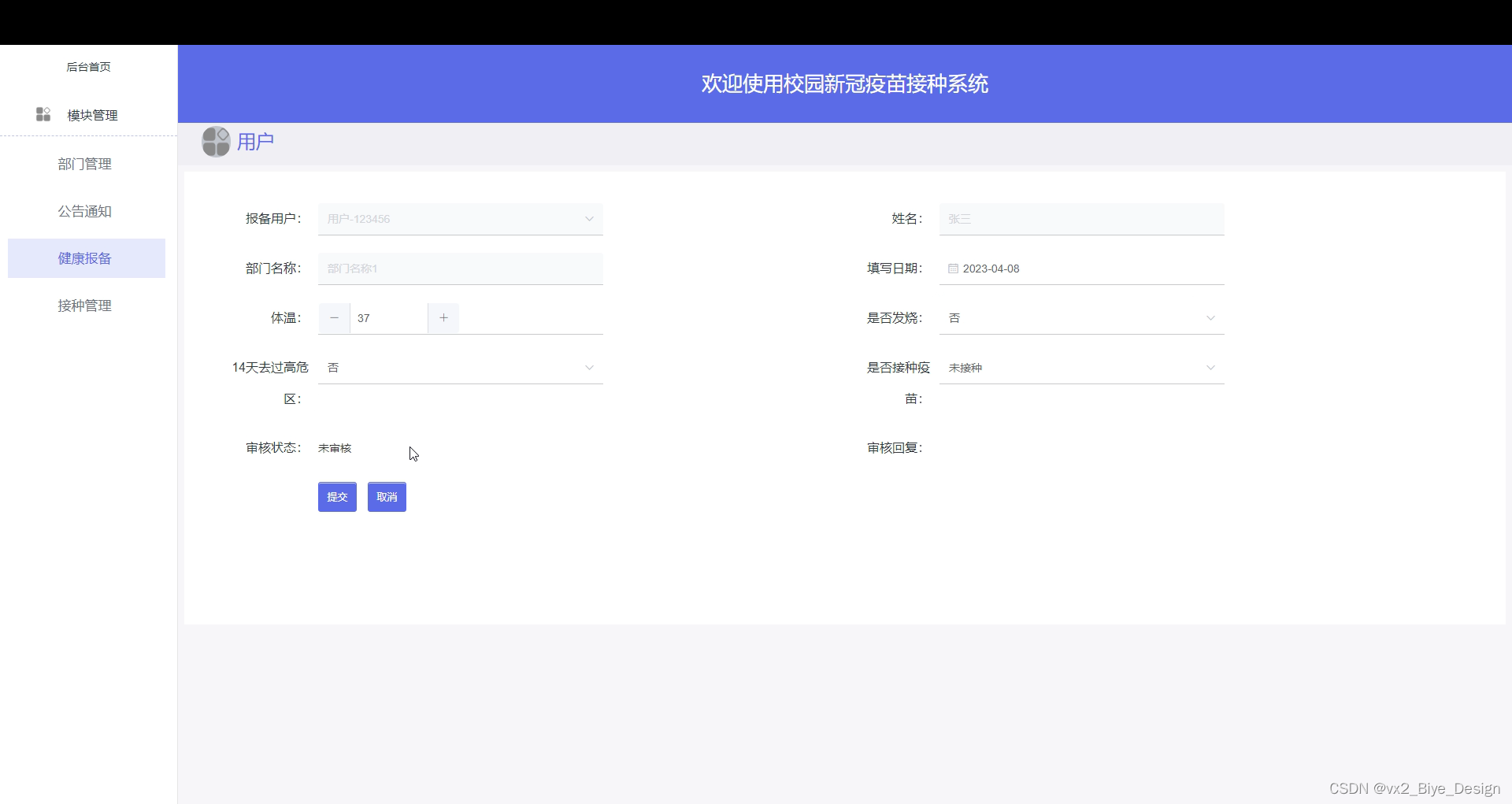 本系统主要是借助信息管理系统,方便校方管理员在疫情期间掌握师生的健康状态以及疫苗接种情况。该系统通过和数据库管理系统软件协作来满足用户的需求,能够有效的解决获取信息便捷化、全面化的问题,提高效率。