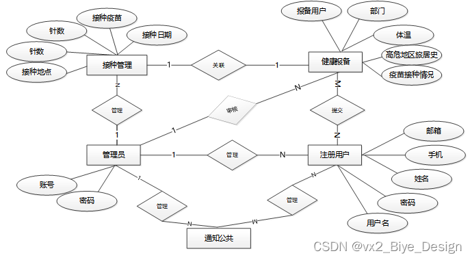 通过校园新冠疫苗接种系统的功能进行规划分成几个实体信息,实体信息将通过ER图进行说明,本系统的主要实体图如下: