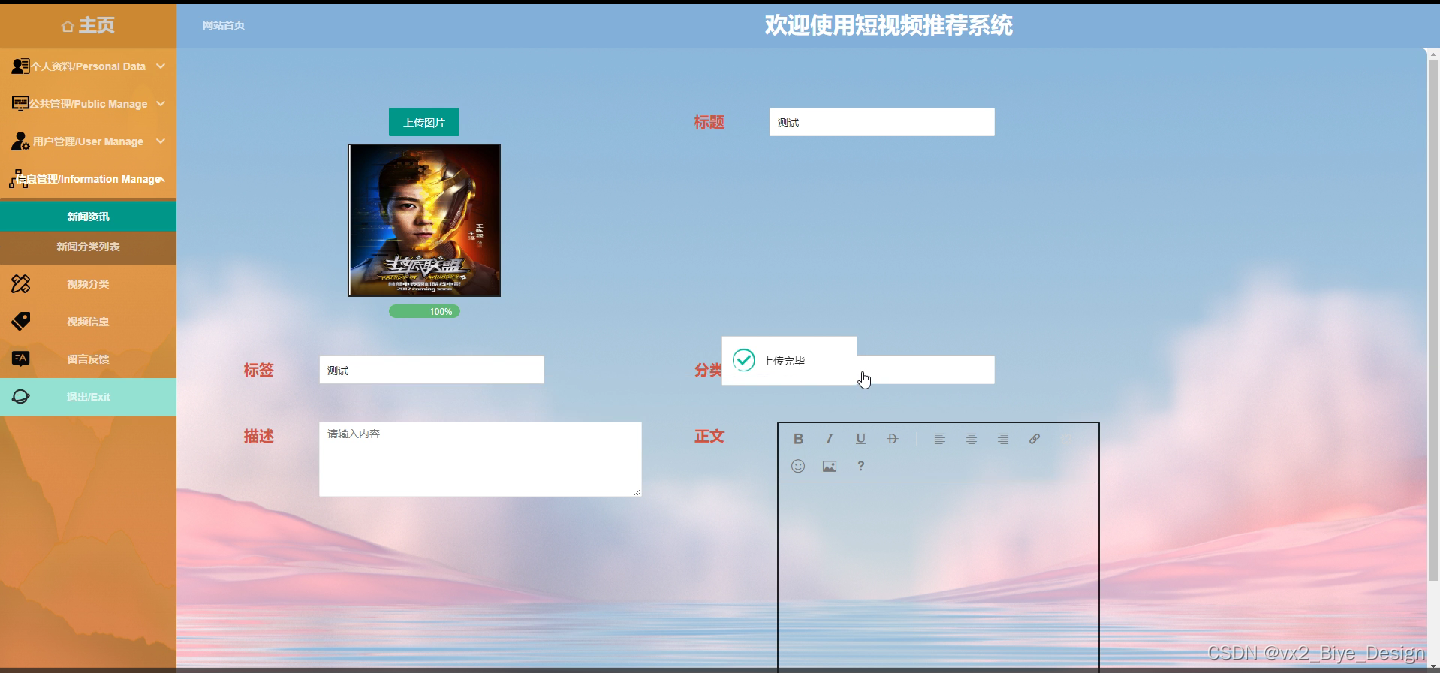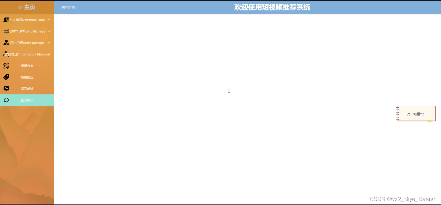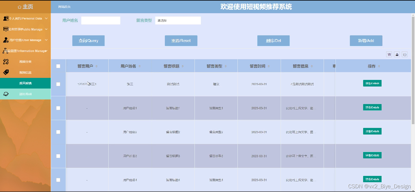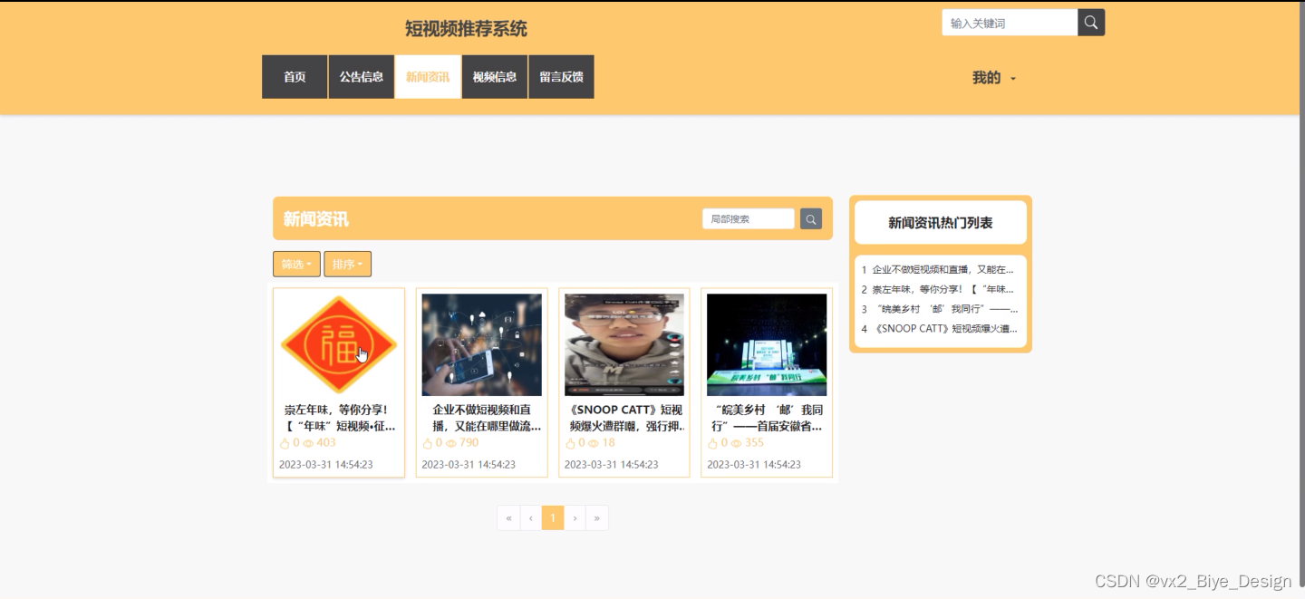 The system adopts a B/S structure, adopting a browser interactive mode for all business modules, selecting MySQL as the system database, and using SpringBoot as the development tool for system design. The main functional modules of the short video recommendation system have been basically implemented. This system has two main functional modules: administrator and user. The administrator includes the homepage, personal information, public management (such as broadcast images and announcement information), user management (such as administrators and ordinary users), information management (such as news information and news classification lists), video classification, video information, and message feedback; Users: Home page, message board, announcement information, news information, video information, message feedback, and other operations.