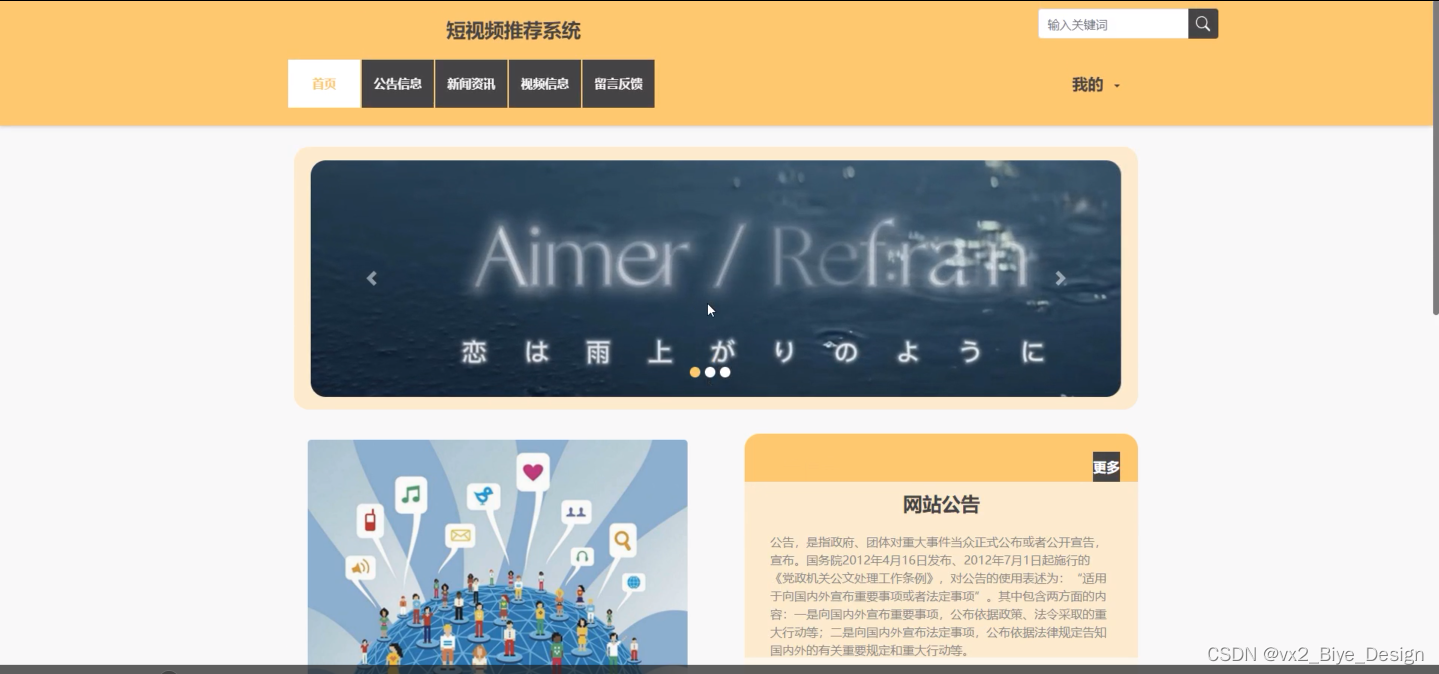 系统用户登录短视频推荐系统,功能为:首页,公告信息,新闻资讯,视频信息,留言反馈,我的等功能,如下图所示: