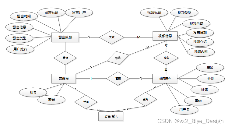 通过短视频推荐系统的功能进行规划分成几个实体信息,实体信息将通过ER图进行说明,本系统的主要实体图如下: