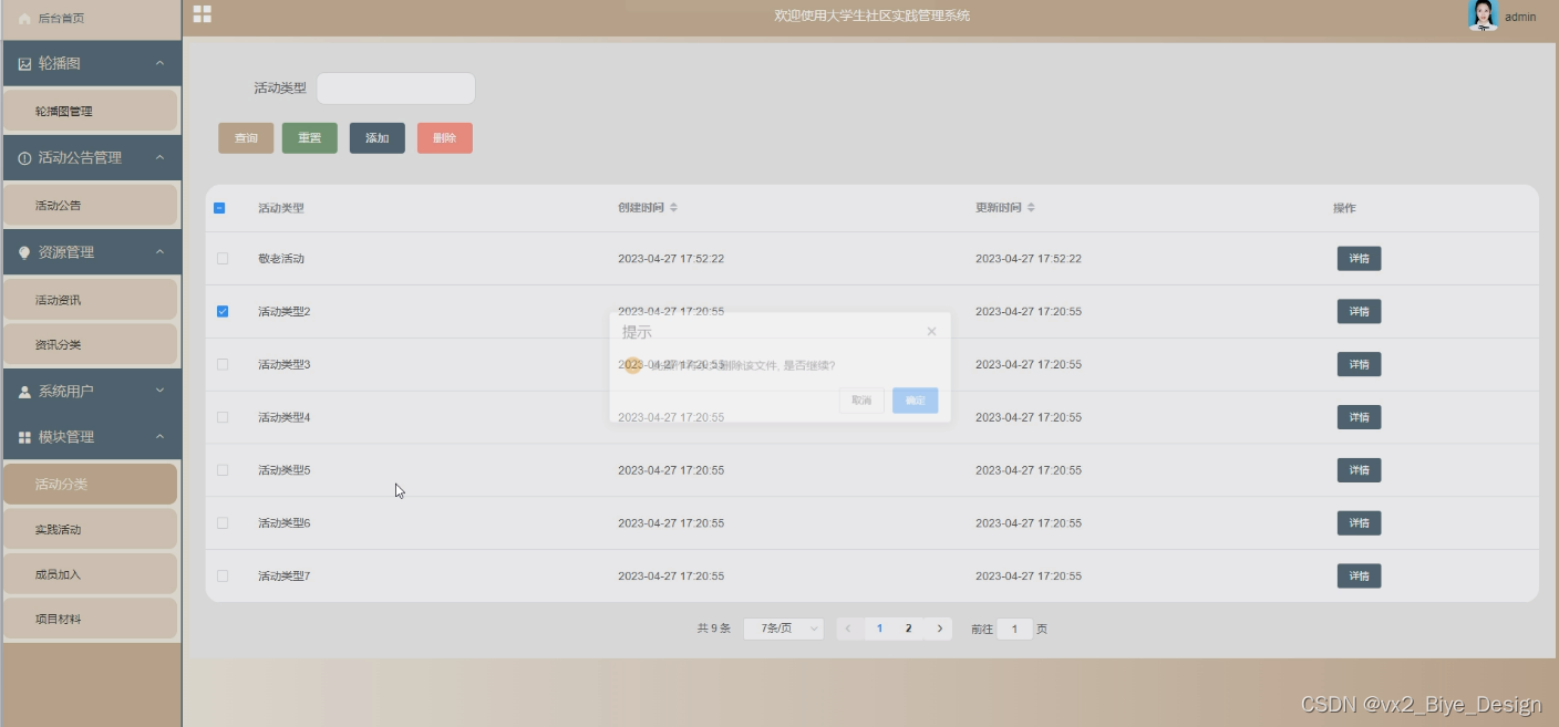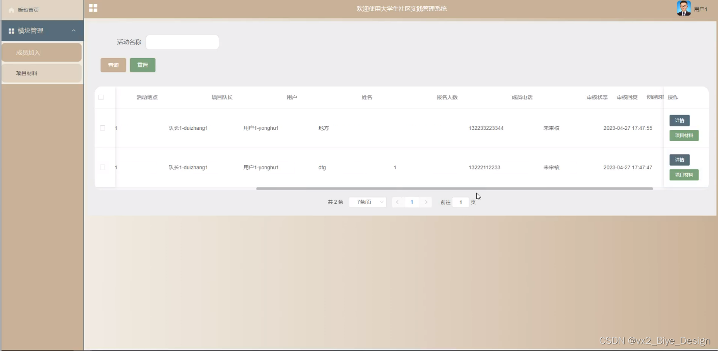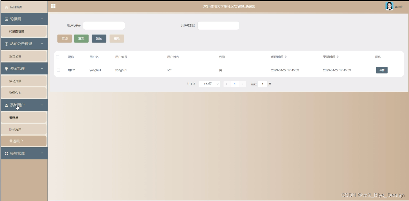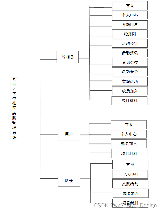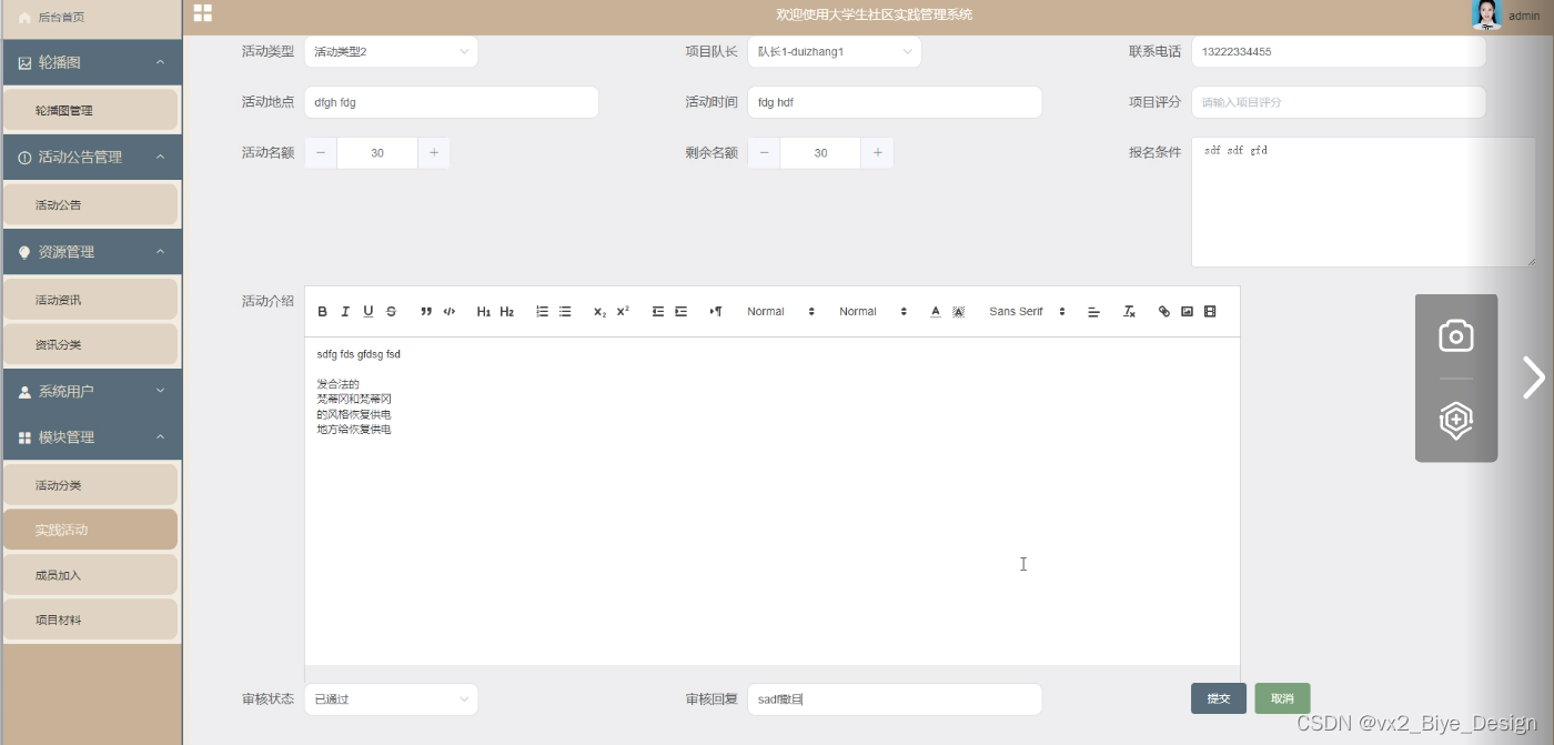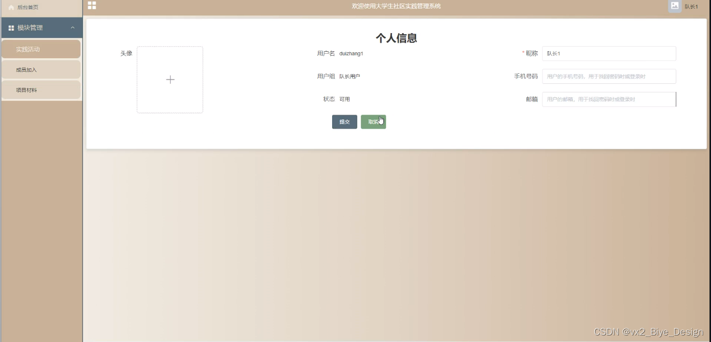 (1)功能要求:可以管理后台首页、轮播图(轮播图管理)、活动公告管理(活动公告)、资源管理(活动资讯、资讯分类)、系统用户(管理员、队长用户、普通用户)、模块管理(活动分类、实践活动、成员加入、项目材料)、个人中心等功能模块。