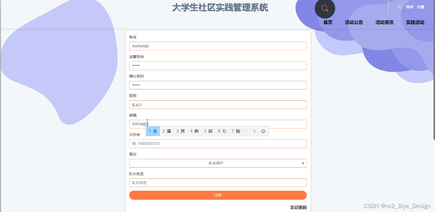 3、功能的完善性:可以管理首页、轮播图(轮播图管理)、活动公告管理(活动公告)、资源管理(活动资讯、资讯分类)、系统用户(管理员、队长用户、普通用户)、模块管理(活动分类、实践活动、成员加入、项目材料)、个人中心模块的修改维护操作。