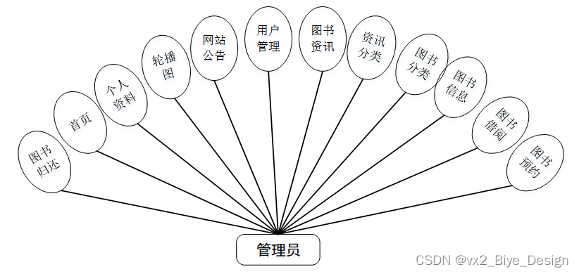 系统中的核心用户是系统管理员,管理员登录后,通过管理员菜单来管理后台系统。主要功能有:首页、个人资料(个人信息、修改密码)、公共管理(轮播图、网站公告)、用户管理(管理员、读者用户)、信息管理(图书资讯、资讯分类)、图书分类、图书信息、图书借阅、图书归还、图书预约等功能。服务端用例如图3-7所示。