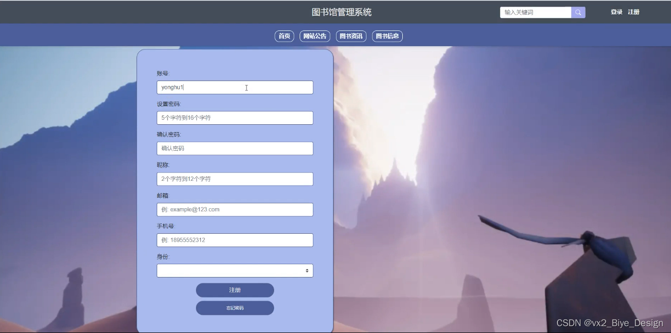 读者注册,在读者注册页面可以填写账户设置密码、确认密码、昵称、邮箱、手机号、身份、姓名、性别、借阅证号等信息,进行注册如图5-1所示。