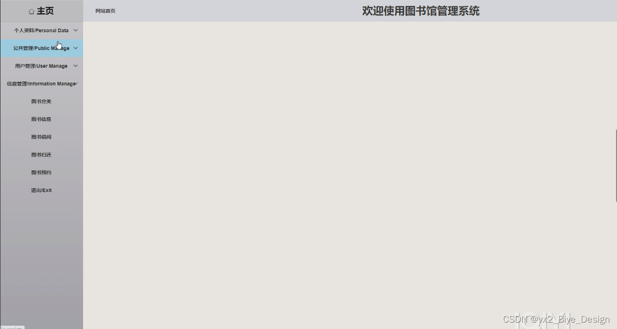 管理员登录进入图书馆管理系统可以查看首页、个人资料(个人信息、修改密码)、公共管理(轮播图、网站公告)、用户管理(管理员、读者用户)、信息管理(图书资讯、资讯分类)、图书分类、图书信息、图书借阅、图书归还、图书预约等内容进行详细操作,如图5-8所示。