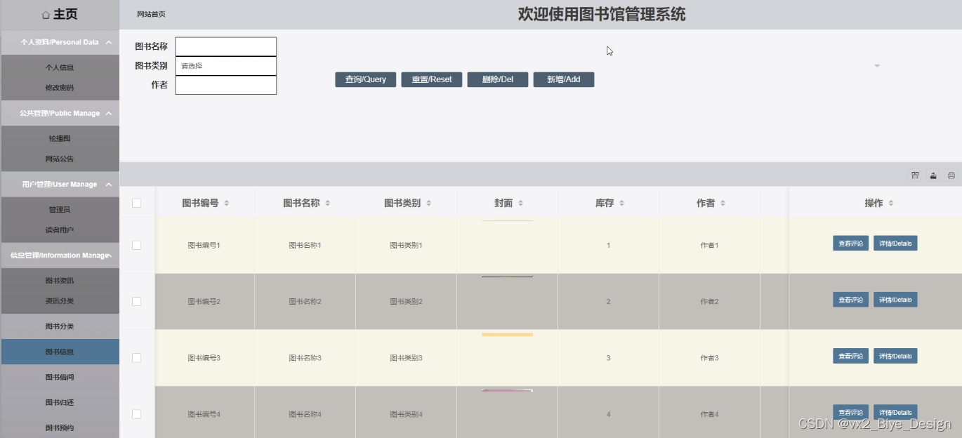 图书信息管理,在图书信息管理页面可以对索引、图书编号、图书名称、图书类别、封面、库存、作者等信息进行详情查看评论、修改或删除等操作,如图5-10所示。