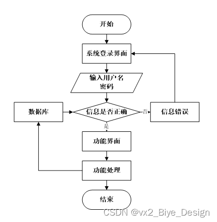 用户打开并进入系统后,会先显示登录界面,输入正确的用户名和密码,系统自动检测信息,若信息无误,则用户会进入系统功能界面,进行操作,否则会提示错误无法登录,操作流程如图3-3所示。