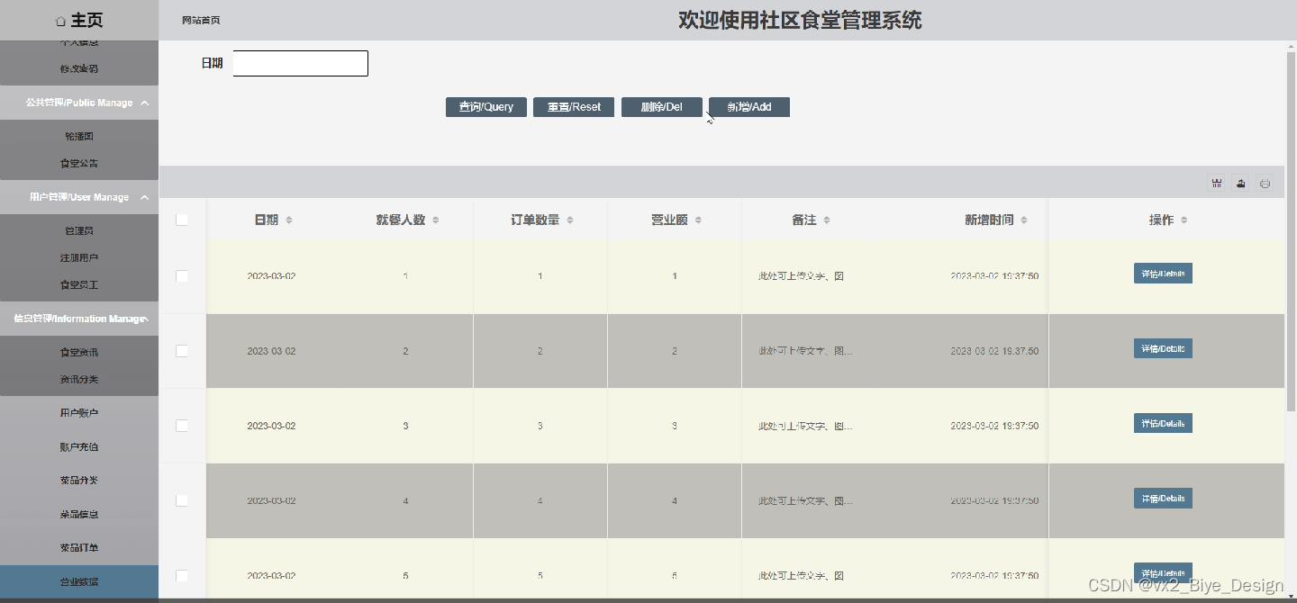 营业数据管理:存储食堂营业等详情数据项。