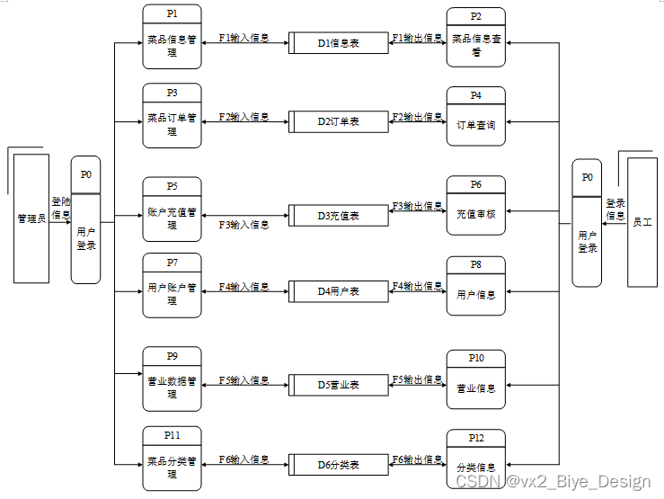 对系统的数据流进行分析,系统的使用者分为二类,一般用户(食堂员工、普通用户),管理员。系统主要对界面信息传送,登录信息的验证,注册信息的接收,用户各种操作的响应做处理。