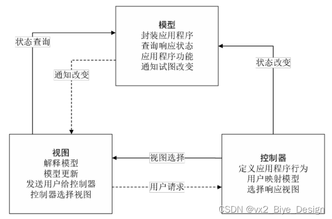 MVVM 就是将其中的View 的状态和行为抽象化,让我们将视图 UI 和业务逻辑分开。当然这些事 ViewModel 已经帮我们做了,它可以取出 Model 的数据同时帮忙处理 View 中由于需要展示内容而涉及的业务逻辑。它强制性的把应用程序的输入、输出和处理全部分开,将其分为三个核心部分,这三个部分分别有不同的功能。