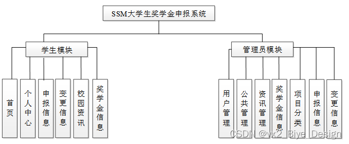 大学生奖学金申报系统在对需求做解析后,整个系统主要分为两个部分:管理员和学生,每个模块下的分支功能不一样。对功能做出如下说明: