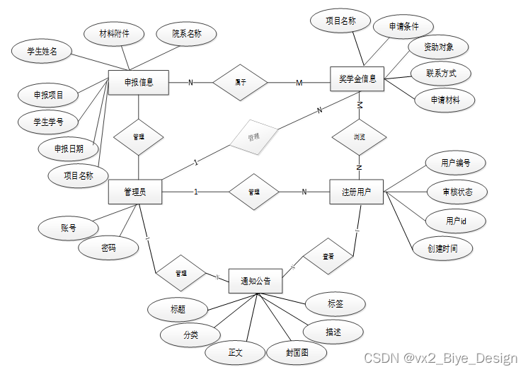 对于一个要开发的系统来说,E-R图可以让别人能更快更轻松的了解此系统的事务及它们之间的关系。根据系统分析阶段所得出的结论确定了在大学生奖学金申报系统中存在着多个实体分别是用学生、管理员、奖学金、奖学金申请、。