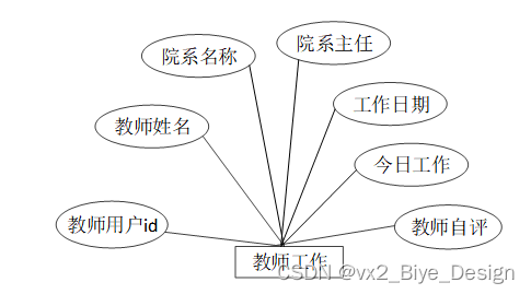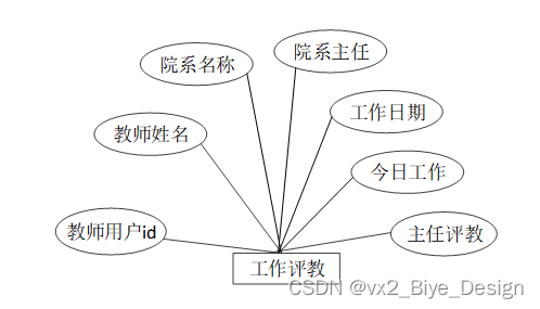 在数据库概念模型设计的时候,一般都采用E-R实体图进行展示,在实体图中可以展示出数据库表中的所有字段名称,本高校评教教师工作量管理系统中的主要的数据库E-R模型图如下图所示。
