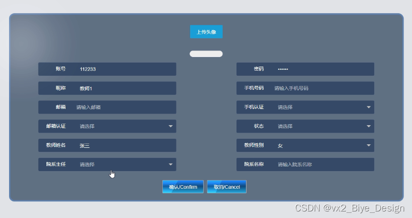 管理员和院系主任、教师用户点击“个人信息”按钮,可以对个人的头像、昵称、手机号码等信息进行更新;个人信息界面如下图4.9所示。
