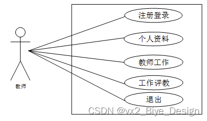 高校评教教师工作量管理系统中教师角色功能包含了登录、首页、个人资料、教师工作、工作评教、退出的功能,教师的用例图如图2.3所示: