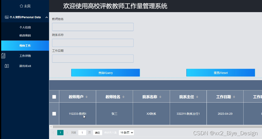 工作评教:可以查看、删除和添加所有的教师用户,院系名称,院系主任,工作日期等内容。