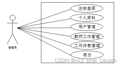 高校评教教师工作量管理系统中管理员角色功能包含了登录、首页、用户管理、个人资料、教师工作、工作评教、退出的功能,管理员的用例图如图2.2所示: