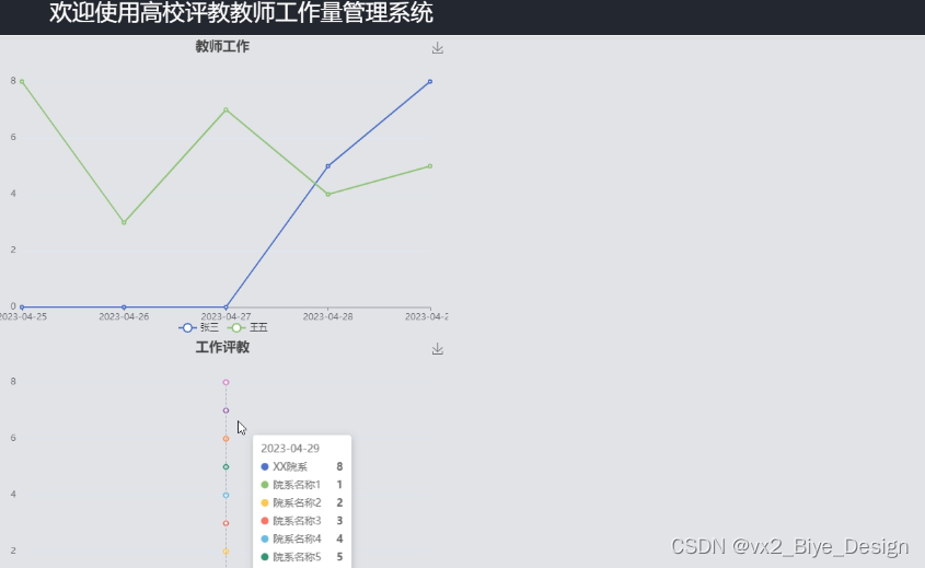管理员登录成功以后会在首页界面以分析图的形式查看到系统中的教师工作信息统计和工作评教信息统计信息。界面如下图4.3所示。