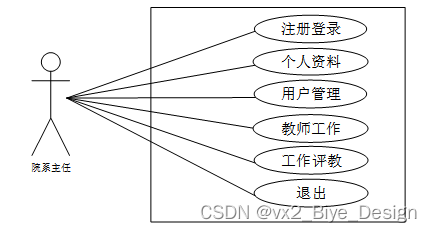高校评教教师工作量管理系统中院系主任角色功能包含了登录、首页、用户管理、个人资料、教师工作、工作评教、退出,院系主任的用例图如图2.1所示: