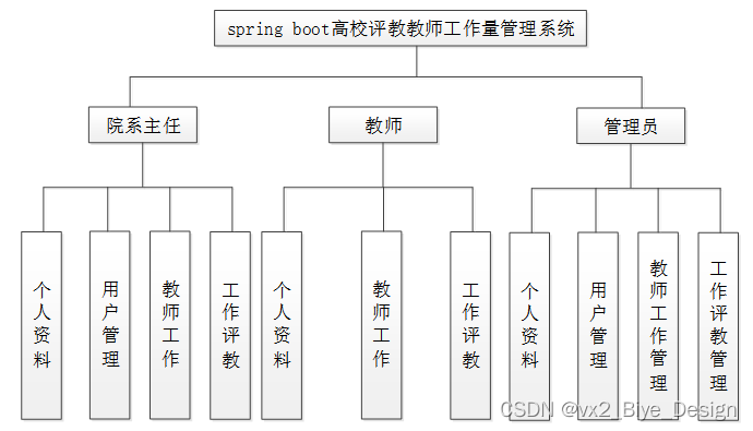 通过上一章节的功能需求分析,可以得出本高校评教教师工作量管理系统的功能结构图,图3.1就是高校评教教师工作量管理系统的功能模块图。