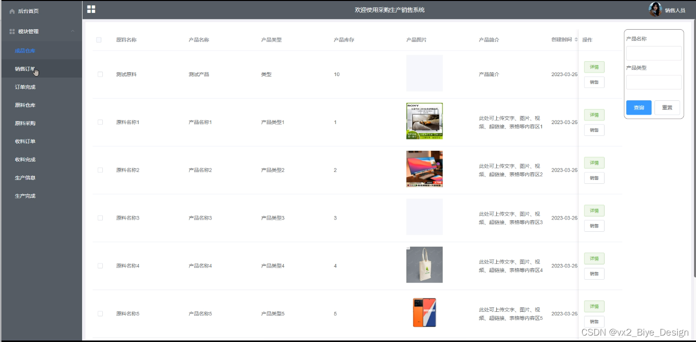 销售人员登录进入采购生产销售系统可以对首页、个人中心、模块管理(成品仓库、销售订单、订单完成、原料仓库、原料采购、收料订单、收料完成、生产信息、生产完成)等进行相应的操作管理,如图5-6所示。