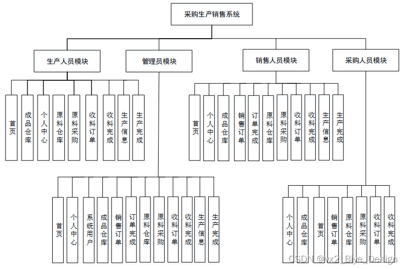 The system adopts a B/S structure, using a browser interactive mode for all business modules, selecting MySQL as the system database, and selecting My Eclipse as the development tool to design the system. The main functional modules of the purchase, production, and sales system have been basically implemented. The system includes four functional modules: administrator, salesperson, purchaser, and production personnel. The administrator: background homepage, system users (administrator, salesperson, purchaser, and production personnel) Module management (finished product warehouse, sales order, order completion, raw material warehouse, raw material procurement, material receipt order, material receipt completion, production information, production completion), personal center, and other operations.