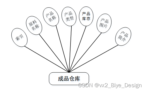 成品仓库管理主要包括索引、原料名称、产品名称、产品名称、产品类型、产品库存、产品图片、产品简介等属性,成品仓库管理属性图如图4-5所示。