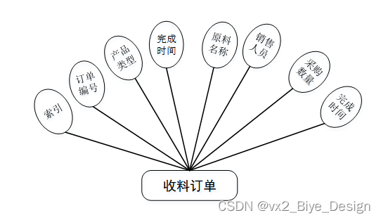 收料订单管理实体属性主要包括索引、订单编号、产品类型、完成时间、原料名称、销售人员、产品名称、采购数量等属性。收料订单管理实体属性图如图4-6所示。