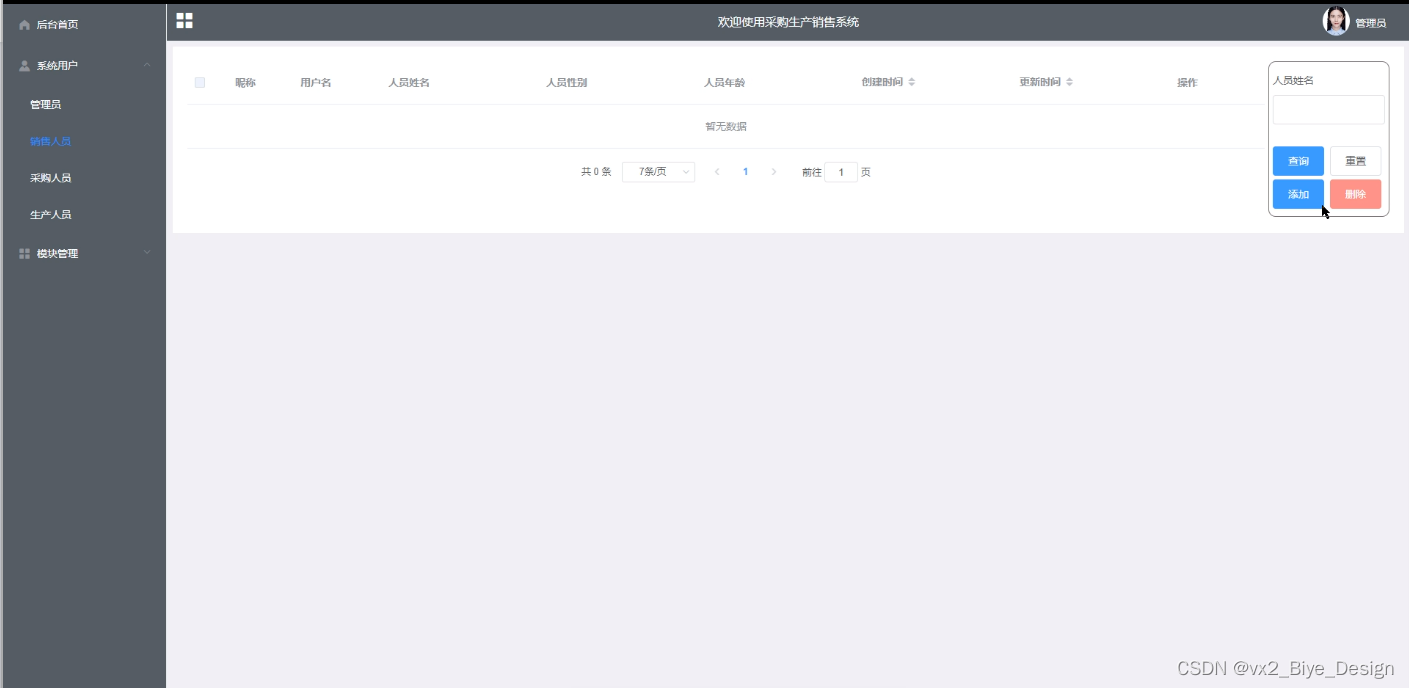 管理员登录进入采购生产销售系统之后,就可以对所有的信息进行查看,可以查看到首页、 系统用户(管理员、销售 人员、采购人员、生产人员)、模块管理(成品仓库、销售订单、订单完成、原料仓库、原料采购、收料订单、收料完成、生产信息、生产完成)、个人中心等,并且还可以对其进行相应的操作管理,如图5-2所示。