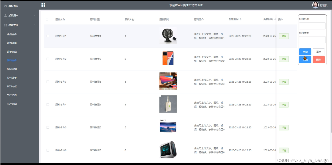 原料仓库管理,在原料仓库管理页面中可以对索引、原料名称、原料类型、原料类型、原料库存、原料图片、原料简介等信息进行详情、修改或删除等操作,如图5-4所示。