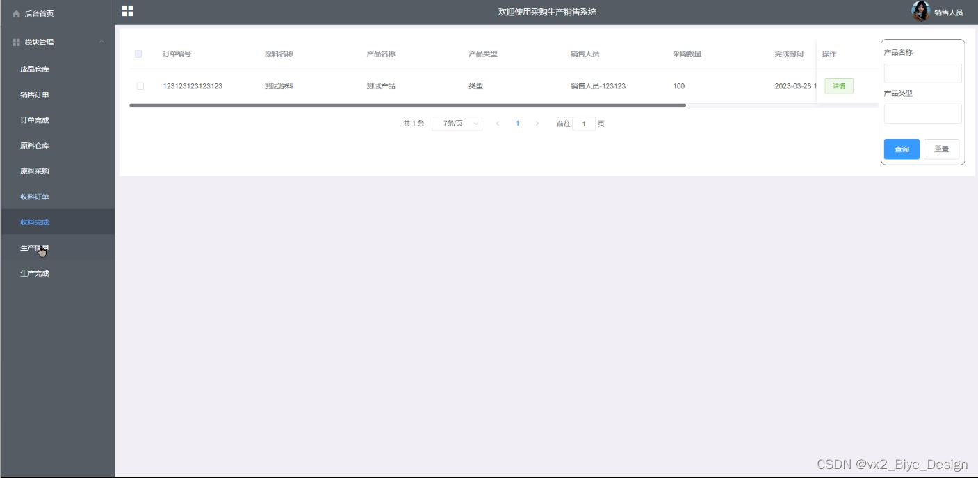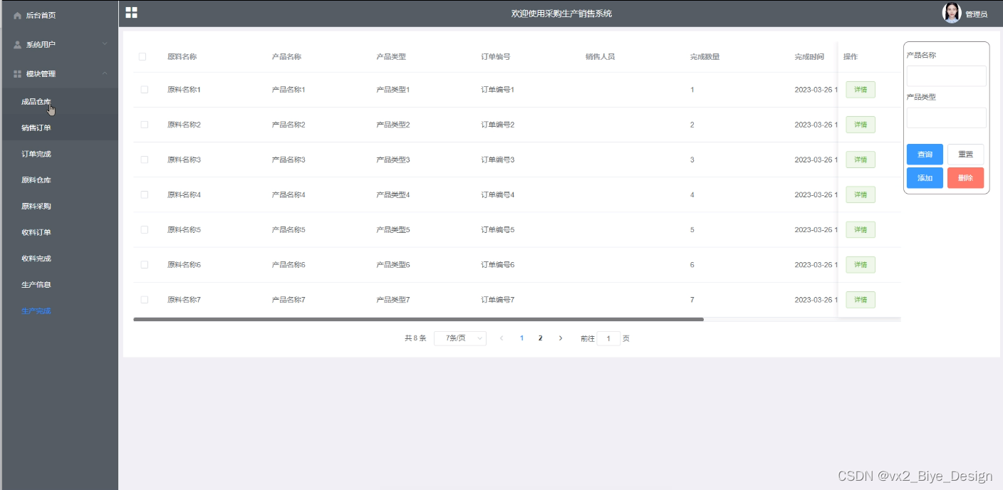 生产完成管理,在生产完成管理页面中可以对索引、原料名称、产品名称、产品类型、订单编号、销售人员、完成数量、完成时间等信息进行详情、修改或删除等操作,如图5-5所示。