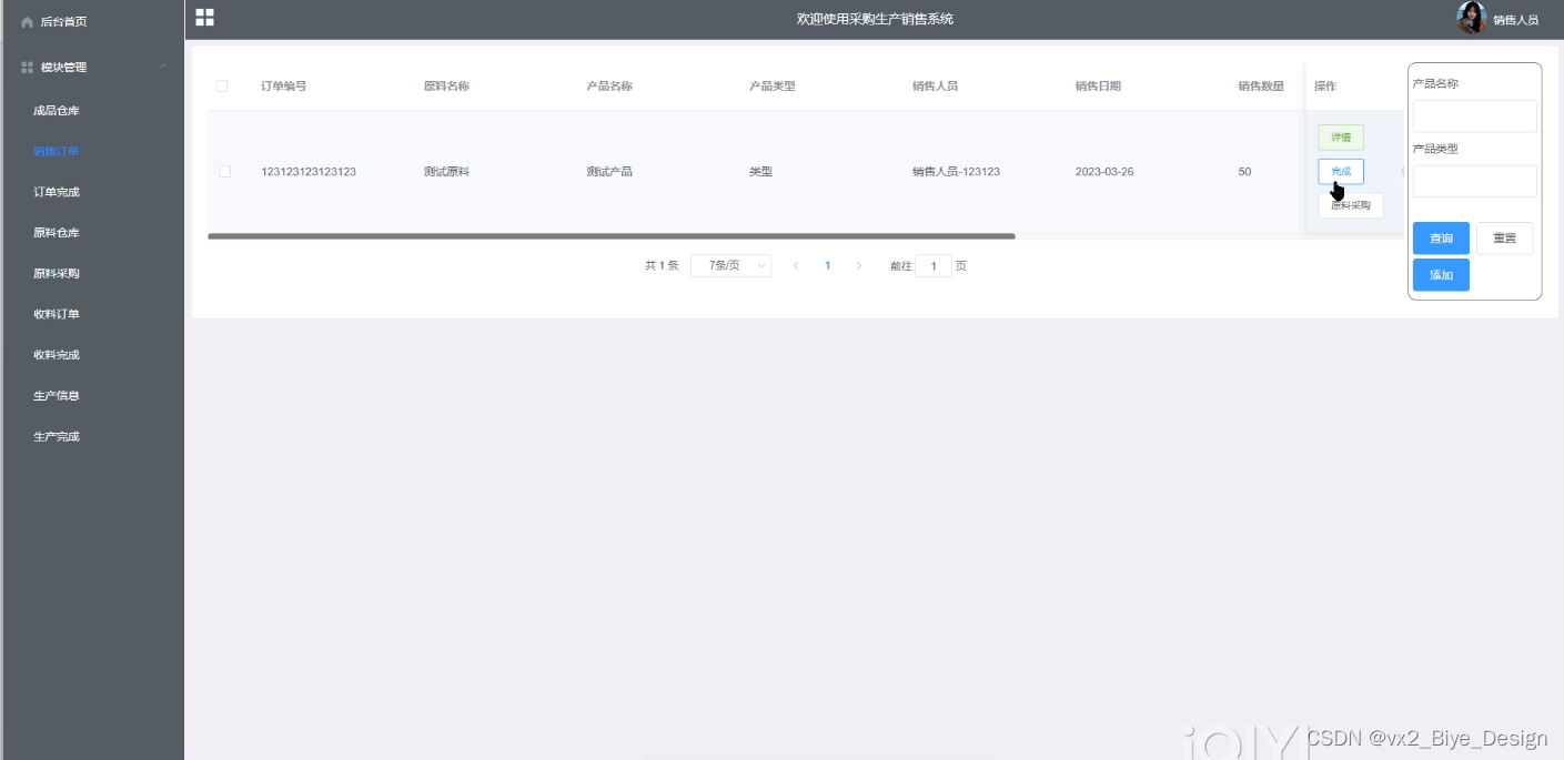 销售订单,在销售订单页面中可以填写订单编号、原料名称、产品名称、产品类型、销售人员、销售日期、销售数量等信息,并进行完成、原料采购、添加、删除等操作,如图5-7所示。