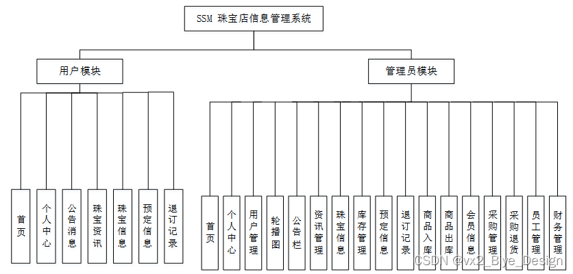 珠宝店信息管理系统的前台中,用户模块和商品模块进行数据交互,实现预定的功能。前台的功能主要包括用户模块、公告消息、珠宝资讯、珠宝信息和订单模块。