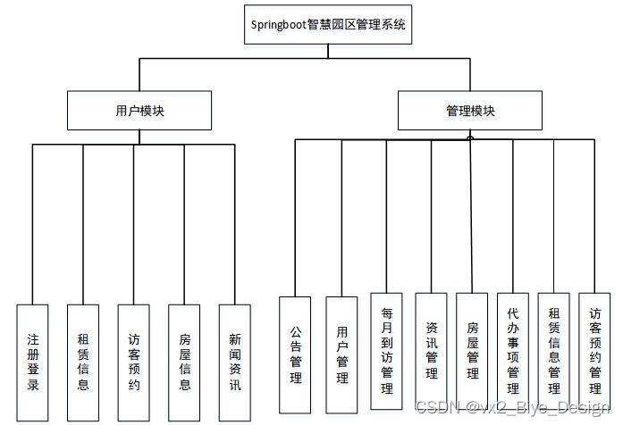 (3)确定好系统使用的技术,进行在线确认系统所划分的用户角色,并且根据用户角色划分确定所要设计的功能模块,对基于Springboot的智慧园区管理系统的设计主要划分用户角色,并所使用的功能模块也相应不同,但是系统的数据库实现的内容是交互的,用户可以随时根据自己的需求进行信息查看,对于系统工作人员可以根据自己的分管内容进行在线信息的处理及操作。