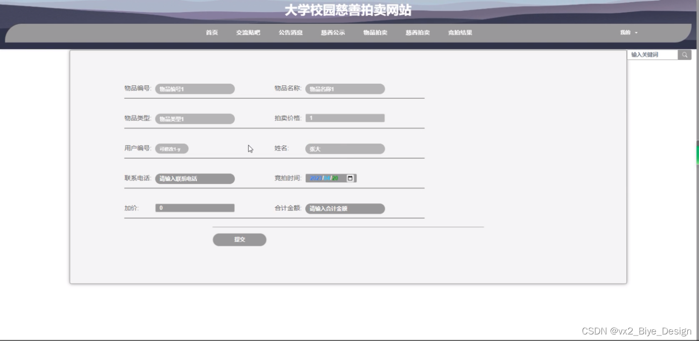 竞拍:用户在此页面输入竞拍时间、联系电话、加价、合计金额等信息进行提交竞拍,如图5-9所示。
